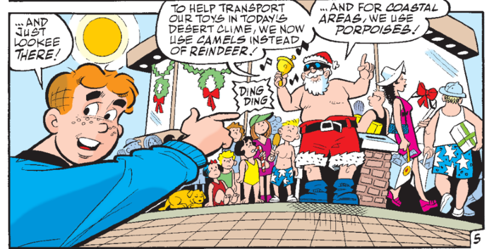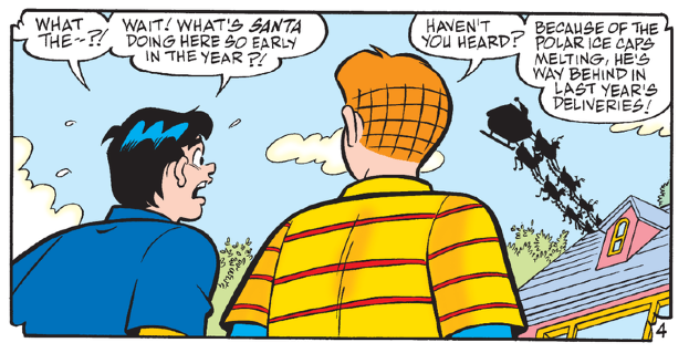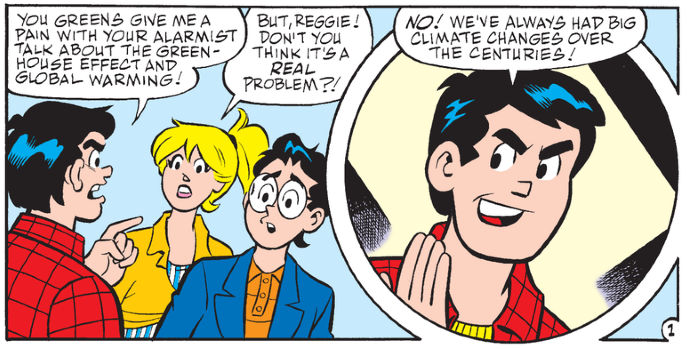 Despite his old-fashioned looks, Archie Andrews is a longtime climate leader. Archie comics have featured environmental themes as early as 1971: Life With Archie #110 contained “A Solution to Pollution,” in which the Riverdale gang convinces Mr. Lodge to stop killing fish in the local river with runoff from his paper mill. And around 1990, stories began appearing that introduced little kids (including me) to the concept of global warming.