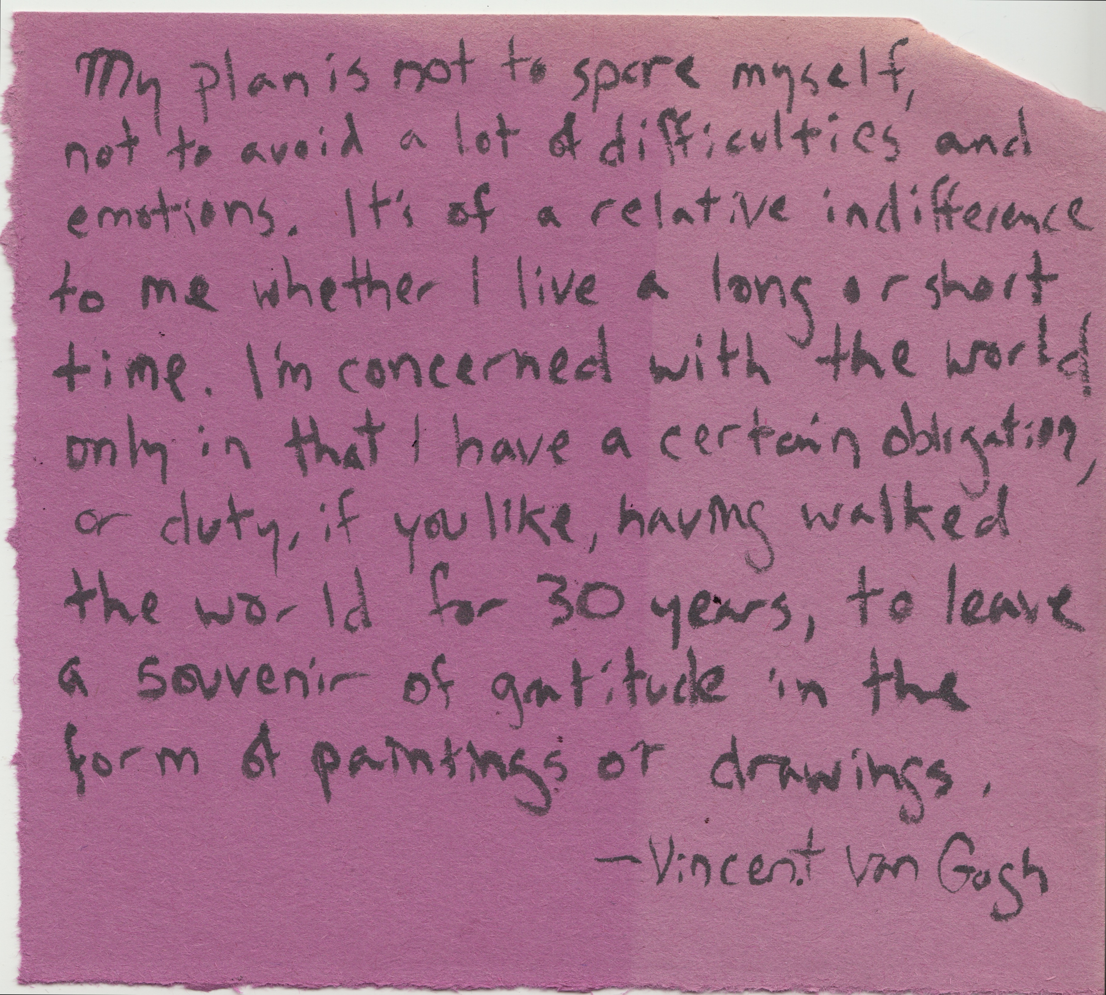 Vincent Van Gogh, in one of over 900 letters to his brother Theo. I learned, by way of this heart-throbby BBC docudrama, that he was once a lay preacher to coal miners in the Borinage of Belgium, and only began painting in his late 20s.