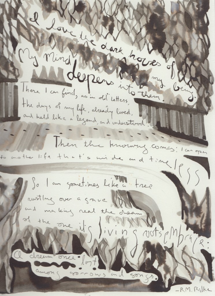 The Rilke poem above had been banging around my head since I’d been home, and I drew it out with a wish for better days for you and me. I love the way it holds past, present and future together all in the same gentle grip.
